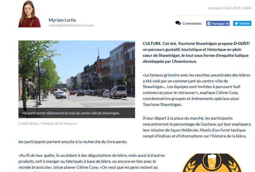 On parle du parcours D-Gust : parcours brassicole à Shawinigan Cet été, venez, vous aussi, tenter de retrouver le grimoire perdu… Pour plus d’informations, voici l’article de l’Hebdo du St-Mauricie