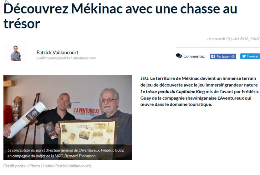 Lancement de notre toute nouvelle aventure : Le trésor perdu du Capitaine King Un jeu immersif grandeur nature qui vous lancera sur les traces d’un trésor enfoui dans la région de Mékinac Pour plus d’informations, voici l’article de l’Hebdo du St-Mauricie